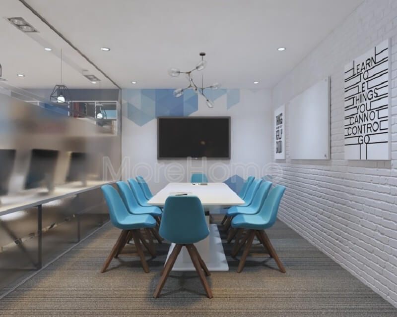 Sử dụng tông màu nhẹ nhàng như xanh nhạt hoặc trắng sẽ giúp không gian cảm giác rộng rãi hơn, đồng thời tạo ra một bầu không khí dễ chịu cho các cuộc thảo luận. Kết hợp với cửa sổ lớn hoặc vách kính có thể giúp ánh sáng tự nhiên tràn vào, làm tăng sự tập trung và sáng tạo của nhân viên.